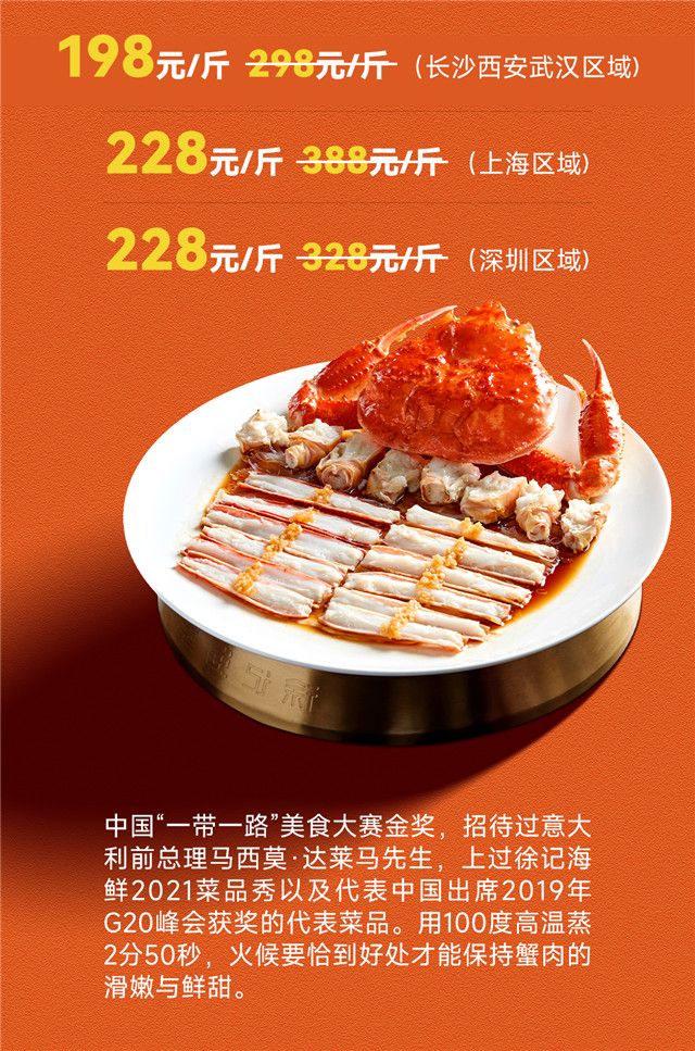 在国内算作高端海鲜的帝王蟹,动辄上千元。如果没有成熟的饲养条件和固定的销售量,一般门店是无法承受它的损耗。而徐记依托60+直营门店,通过海运与陆运接力,确保每一个帝王蟹到货的时候都野性生猛、活力十足!